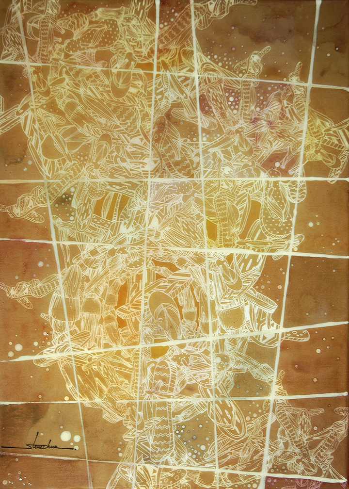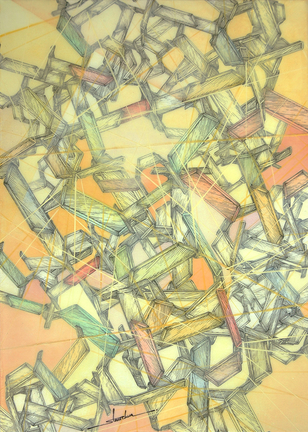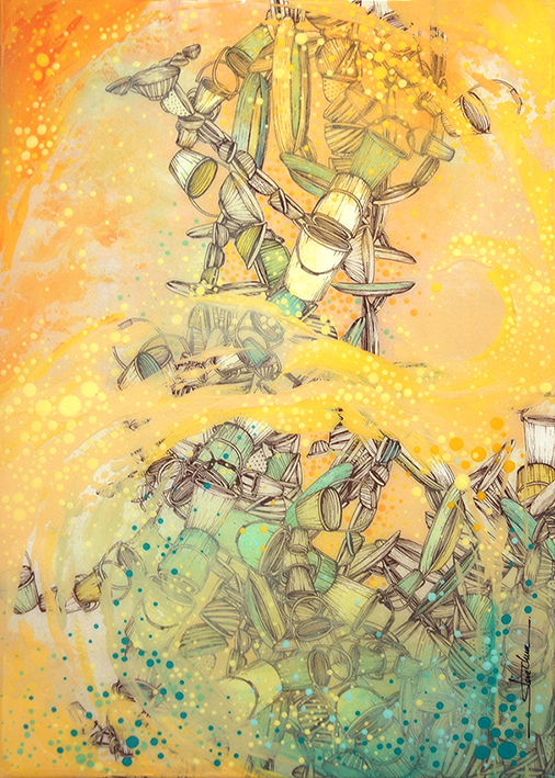 Memories which people hold so dear on to are often evoked with images. For Steve however, his reminiscence materialises from his auditory senses. Growing up in the 80s, the traditional coffee shops and hawker centres became his happy places. His idea of fun was to wander around in these “play- grounds”, relishing in the hustle and bustle of everyday life. The chop-chopping beat of the hawker’s cleaver coupled with the cacophony of the gossips played out like a symphony in his mind. This buzz, while unnoticed by others, were simply “music” to his ears. Using noise as an inspiration, see as Steve renders his acoustic sensory into works of art.